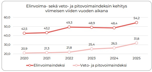 EVP-indeksi pitää sisällään 10 elinvoimamuuttujaa ja 10 veto- ja pitovoimaan liittyvää avainmuuttujaa, joista löytyy vertailukelpoista ja luotettavaa aikasarjatietoa. Viimeisimmän indeksin muutos on mitattu vuosien 2020-2025 aikana.